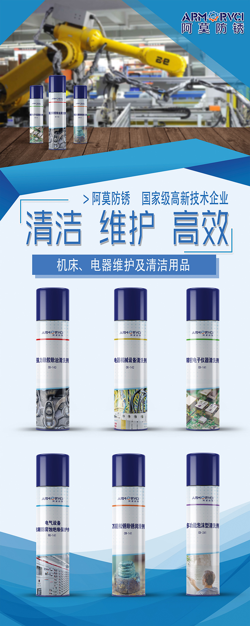 公司的核心產(chǎn)品包括環(huán)保水基清洗劑,水基防銹劑,中性除銹劑和VCI防銹包裝,高效干燥劑產(chǎn)品,廣泛應(yīng)用于高速干式切削HSC,精密零件焊接,免清洗直接裝配領(lǐng)域。