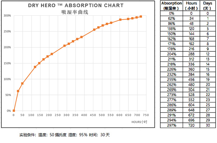 Dry Hero干燥劑吸濕能力可達(dá)到自身重量300%,吸潮能力是普通干燥劑的3-4倍。